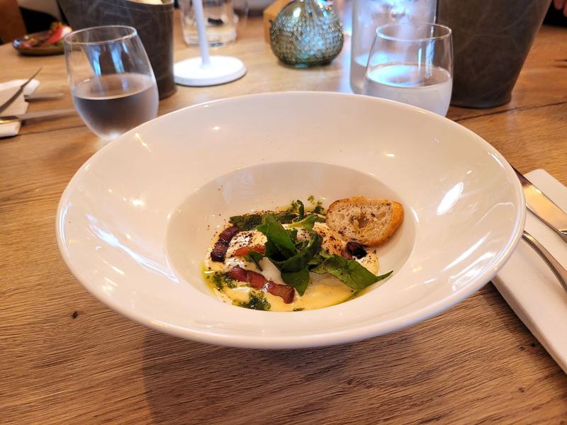 – Suprême de volaille à la crème de chorizo avec écrasé de pommes de terre, mousseline de carotte et petits légumes